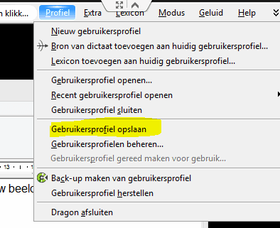De laatste stap is het opslaan van het gebruikersprofiel, zodat het nieuwe taalmodel ook na opnieuw opstarten van Dragon actief blijft. Ga daarvoor in het menu bovenaan naar 'Profiel' en klik op 'Gebruikersprofiel opslaan'.