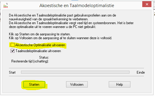 Zorg dat 'Akoestische Optimalisatie uitvoeren' uitstaat en dat 'Taalmodeloptimalisatie uitvoeren' aanstaat.