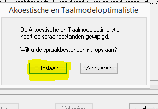 Als eerste verschijnt er een vraag over het opslaan van spraakbestanden. Klik op 'Opslaan'. Het gewijzigde taalmodel is nu in het gebruikersprofiel geplaatst.